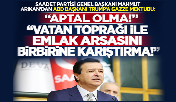 Saadet Partisi Genel Başkanı Mahmut Arıkan, Filistinlileri Gazze’den çıkarma yönündeki açıklamalarıyla tepki çeken ABD Başkanı Donald Trump’a mektup yazdı. Arıkan, mektubunda, "İki seçeneğin var. Ya ateşkesi destekleyerek barış ve insanlıktan yana olacaksın, ya da bölgeyi daha büyük bir ateşe sürükleyerek kanlı bir katil olarak anılacaksın. Koltuğunu çektiğin, Netanyahu’nun planlarına uyup aptal olma" ifadelerini kullandı.